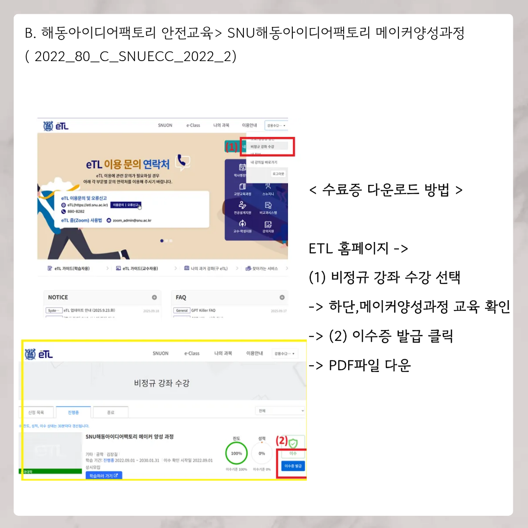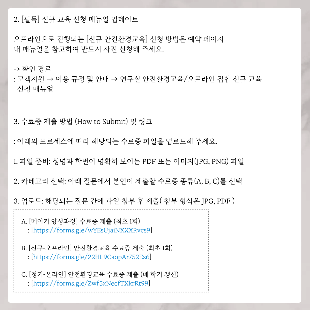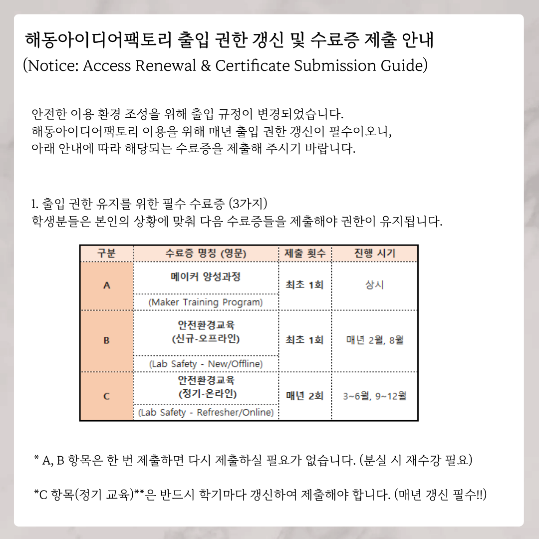[해동아이디어팩토리] 출입 권한 갱신 및 수료증 제출 안내 / Access Renewal & Certificate Submission Guide 작성일 2026-02-02 조회 수 392 첨부파일 안녕하세요해동아이디어팩토리 입니다.