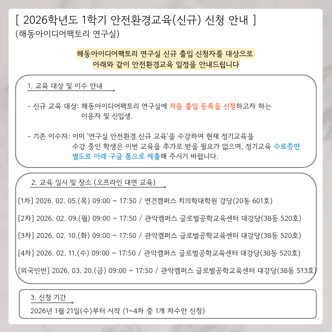[해동아이디어팩토리]연구실 안전환경교육/ 오프라인 집합 신규 교육 신청 안내 작성일 2026-02-27 조회 수 164 첨부파일 붙임5. SAFE 안전환경교육(신규교육) 신청 매뉴얼.pdf DOWNLOAD 안녕하세요해동아이디어팩토리입니다. 이용에 참고 부탁드리겠습니다. 문의) - 행정실 : 02-880-7399 - 카카오톡 채널: @snuif - 환경안전원 담당자: fadong79@snu.ac.kr